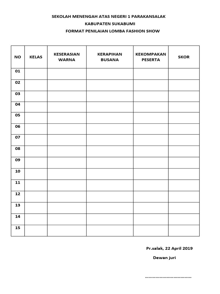 Monday June 4 2012 Edit. Berikut adalah penampakan atau preview dari blangko format kriteria penilaian lomba fashion show islami yaitu perlombaan fesyen yang memakai baju orang islam yang sesuai syari bukan hanya sekedar trend tapi melupakan tutup aurot aurat sang pemakai. Peserta diikuti oleh OPD Suami Isteri dan Dekranasda KabKota.